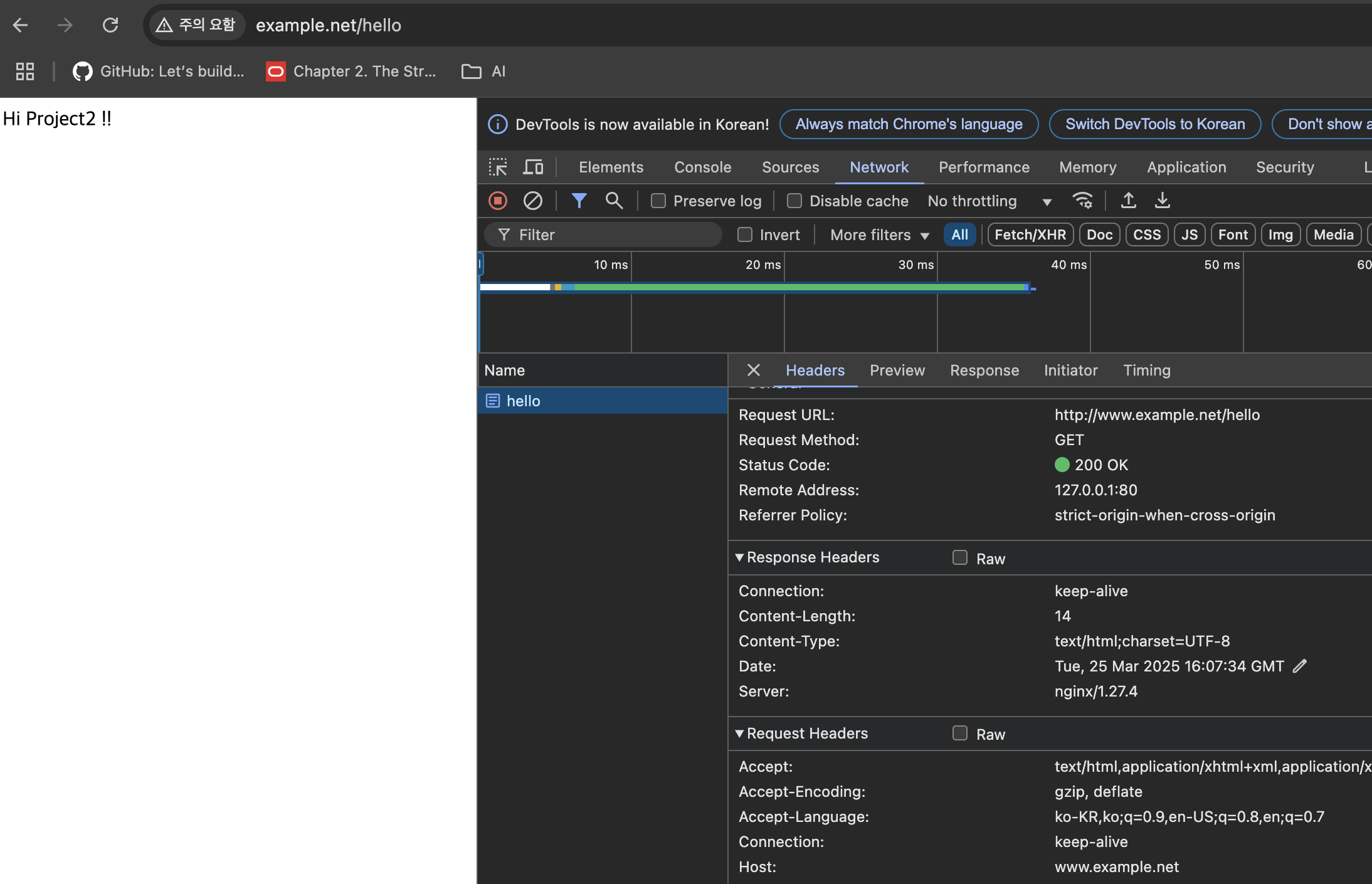 http://localhost:8082/hello접속 시 “Hi Project2” 메시지 출력