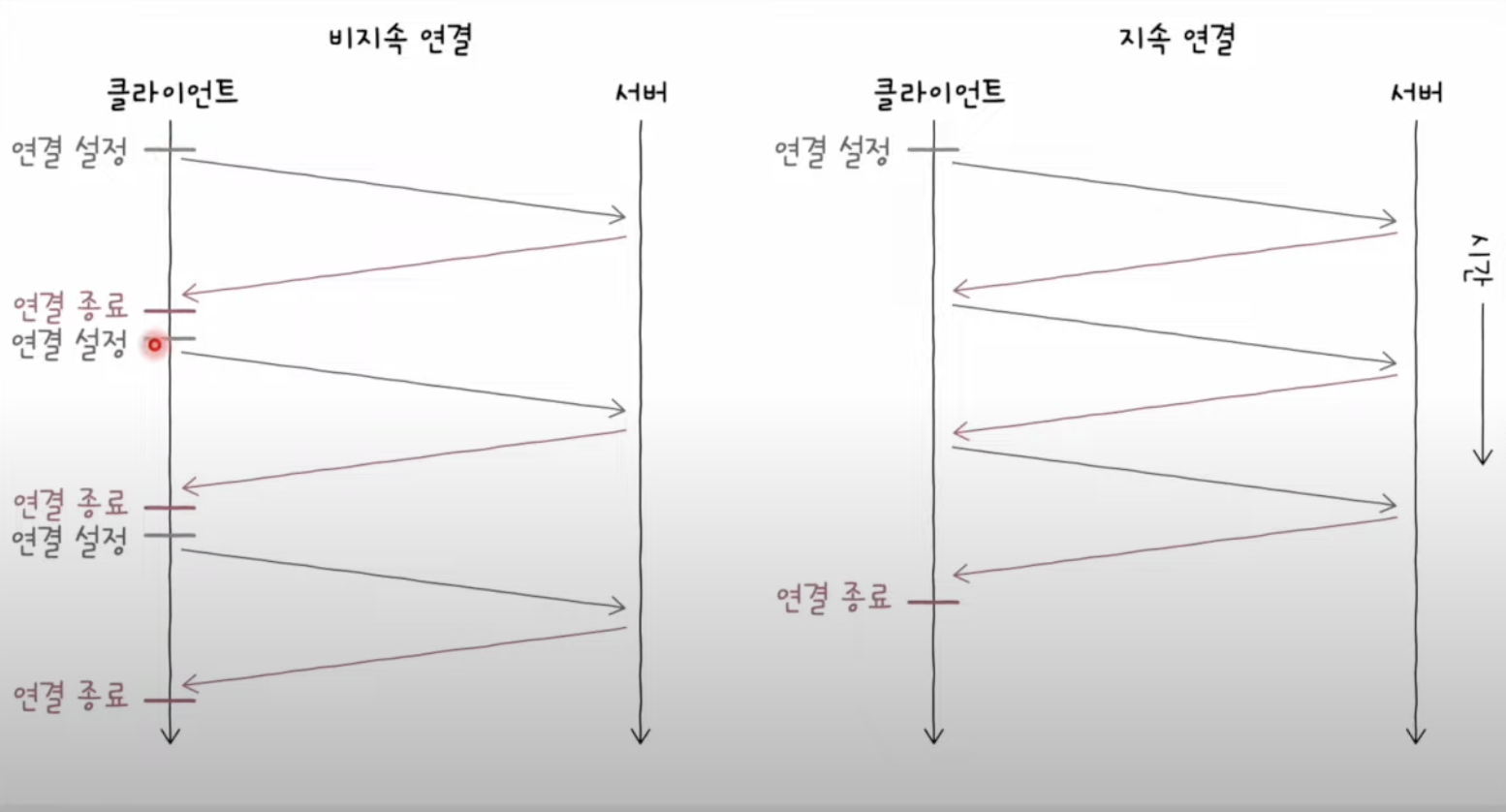 - 초기의 HTTP 버전(1.0 이하)에서는 TCP 연결 수립 후, 요청에 대한 응답을 받으면 연결을 종료하는 비지속 연결 프로토콜이였다.